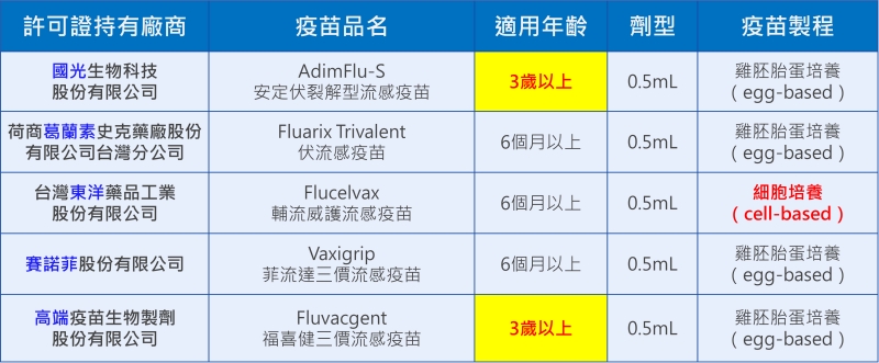 今 (114) 年提供公費流感疫苗共有5家廠牌,皆屬不活化三價流感疫苗,各廠牌之效果與安全性均同。但公費疫苗由衛生局隨機分發,無法選擇廠牌。接種疫苗的免疫力在大約兩週後開始發揮作用。