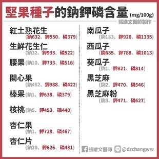 (4) 南瓜子、花生、腰果、瓜子、開心果、芝麻等堅果類,一天不超過1-2湯匙(堅果屬油脂類,含磷量也高)