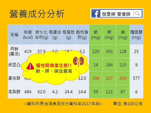 中秋節腎友只要做好以下飲食的主要原則,照常可以享受月圓人團圓的佳節氣氛喔! 1.傳統月餅屬高磷、高鉀、高鈉、高蛋白加工食品,一天切開食用1/8~1/4個就夠了。 2.柚子富含鉀離子,需少量食用,約4~5瓣,一日以1/4顆為上限。 3.烤肉食材選新鮮低脂肉類、魚貝類或豆製品等天然食材,避免香腸、火腿、熱狗、培根、丸子等人工無機磷添加劑之加工食品。 4.烤肉醬可用檸檬汁、柳丁汁、水果醋、蒜末、白蘿蔔泥或開水來稀釋,減少鈉的攝取量,避免口渴灌水體重超標。 5.記得確實隨餐服用鈣片(碳酸鈣或醋酸鈣)等降磷劑,以結合食物中的磷,減少腸胃道對磷的吸收。